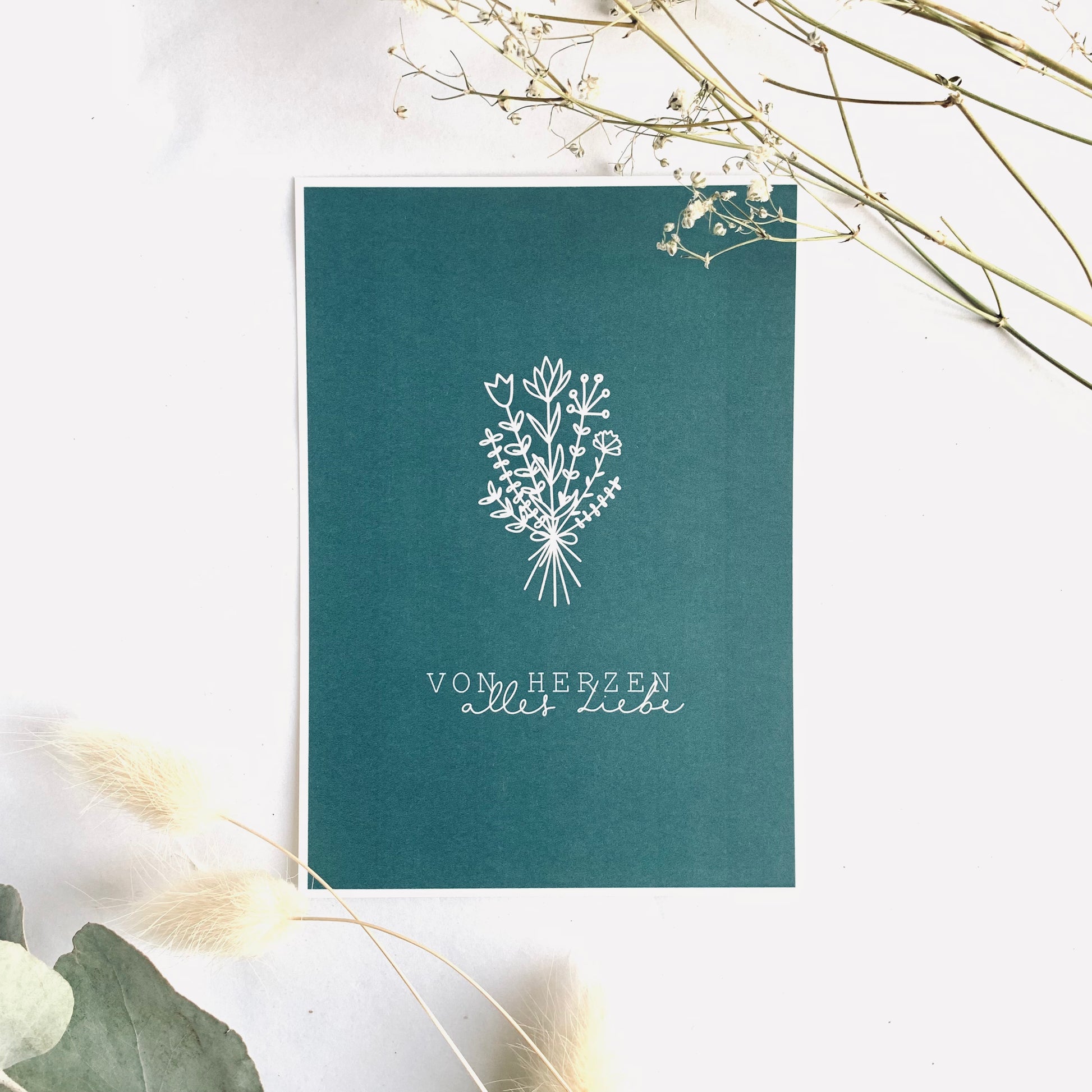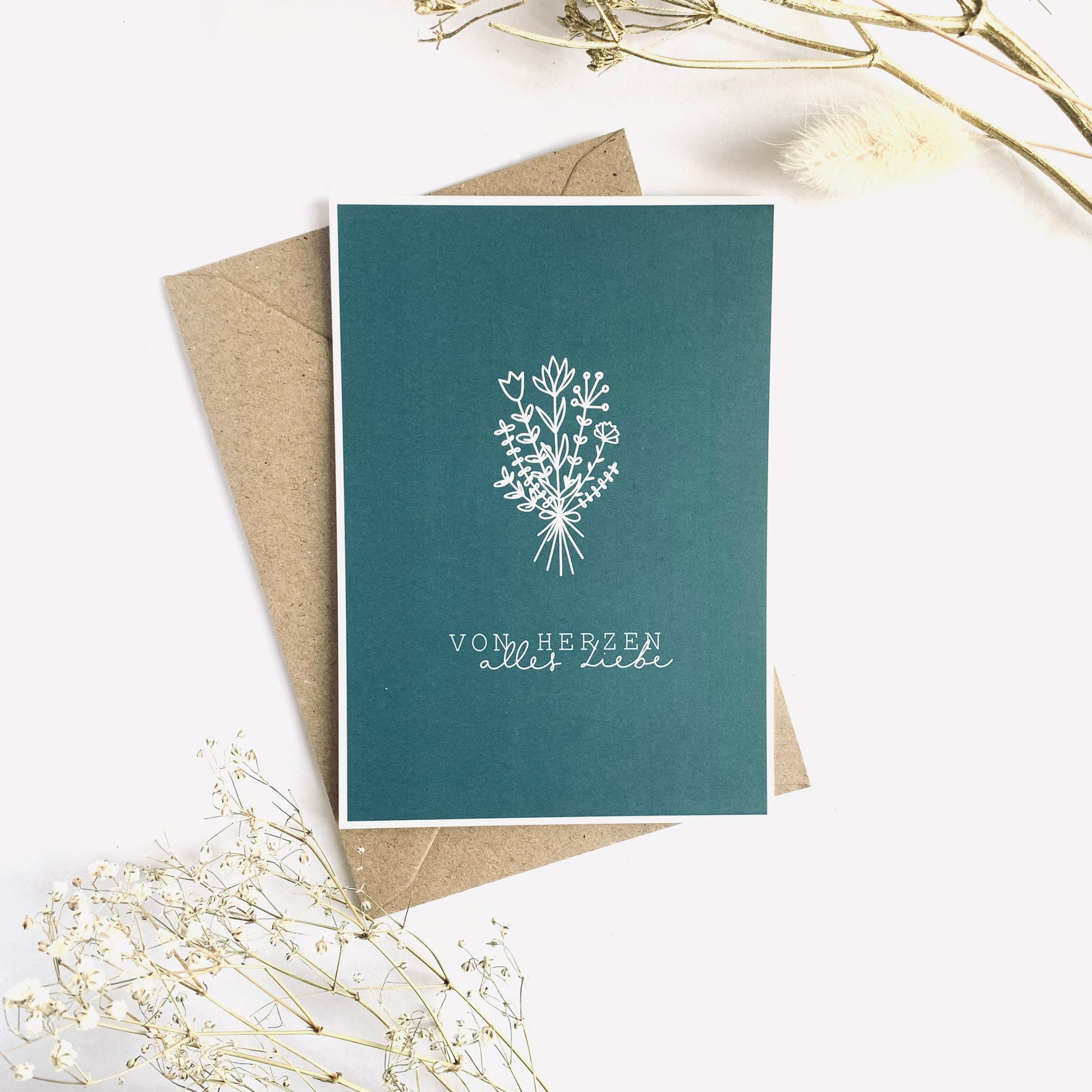 Liebevoll illustrierte Postkarte 'Von Herzen' in DIN A6 Format (10,5 x 14,8 mm), auf Naturpapier in Creme (300 g/m2) und klimaneutral in Deutschland gedruckt. Bestellbar mit oder ohne einen passenden Umschlag in Kraftpapier (11,4 x 16,2 mm).
