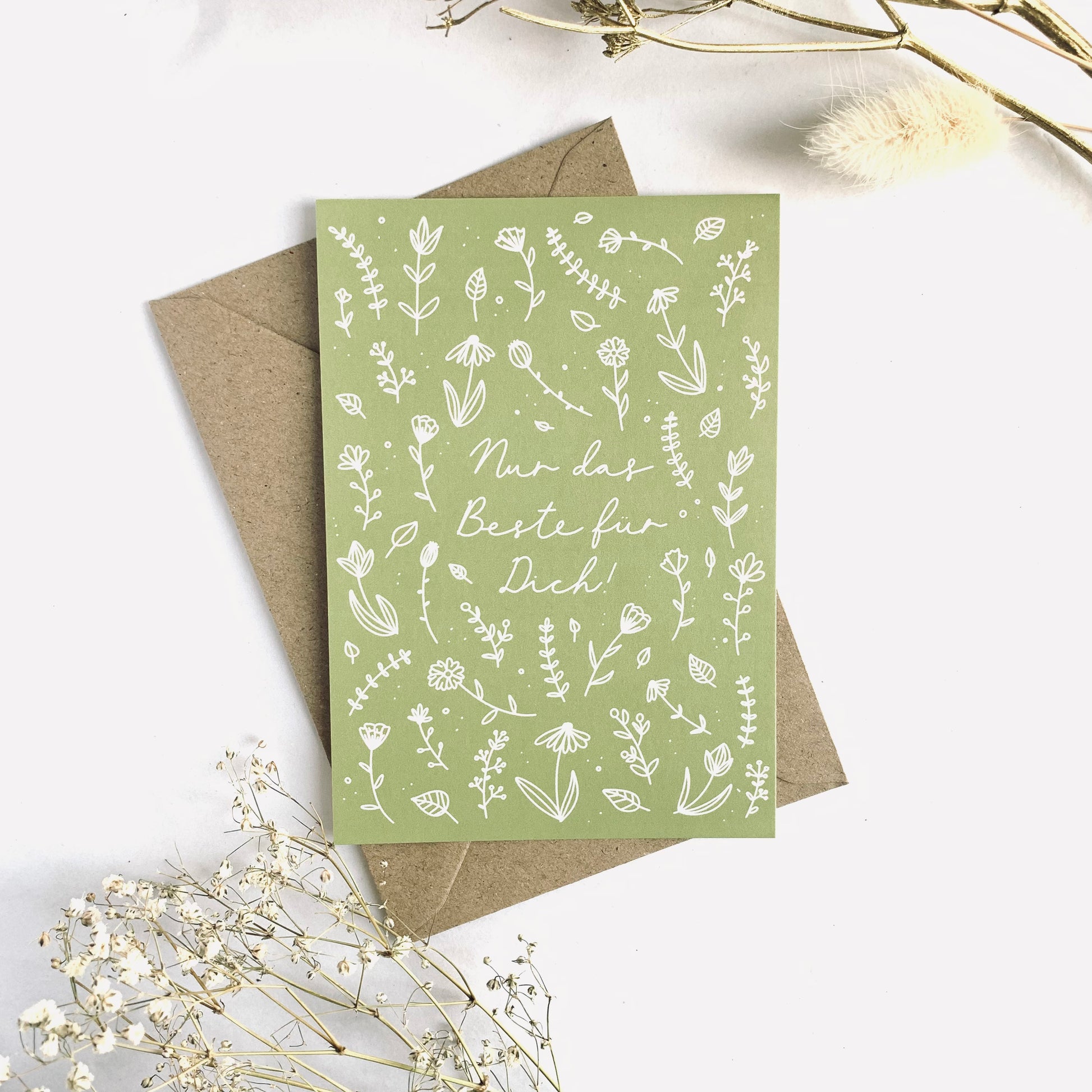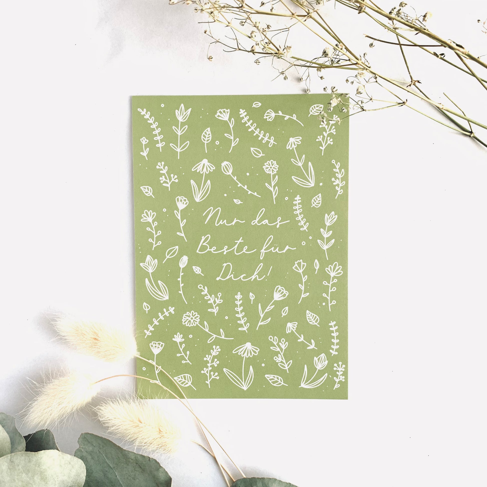 Liebevoll illustrierte Postkarte 'Nur das Beste' in DIN A6 Format (10,5 x 14,8 mm), auf Naturpapier in Creme (300 g/m2) und klimaneutral in Deutschland gedruckt. Bestellbar mit oder ohne einen passenden Umschlag in Kraftpapier (11,4 x 16,2 mm).